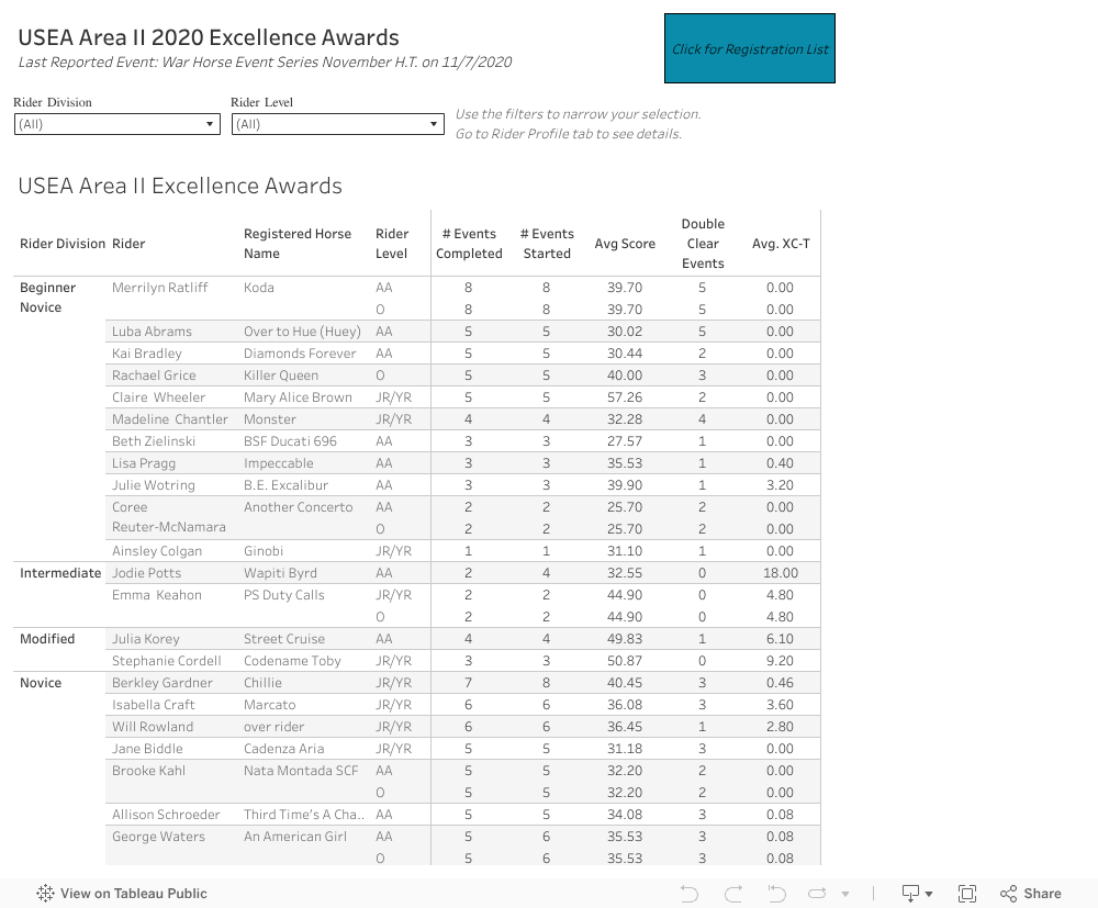 We will post the final averaged scores soon. Please note the table can be sorted several ways, at the moment we have it sorted by the high number of completed events. This may change who is in the top placings! A reminder that this is AVERAGED scores. At years end a minimum number of events will be calculated; your BEST scores from that number will be used for your average final; and those with more double clear results will be placed above less double clear results. We will crunch the numbers and find the average number of completed events for each class and base the high average on that number. Remember, our new Area II scoring system averages your score and makes note of your best results for an average, rather than points for placings. For more information please see the Competitions/Year End Awards page.